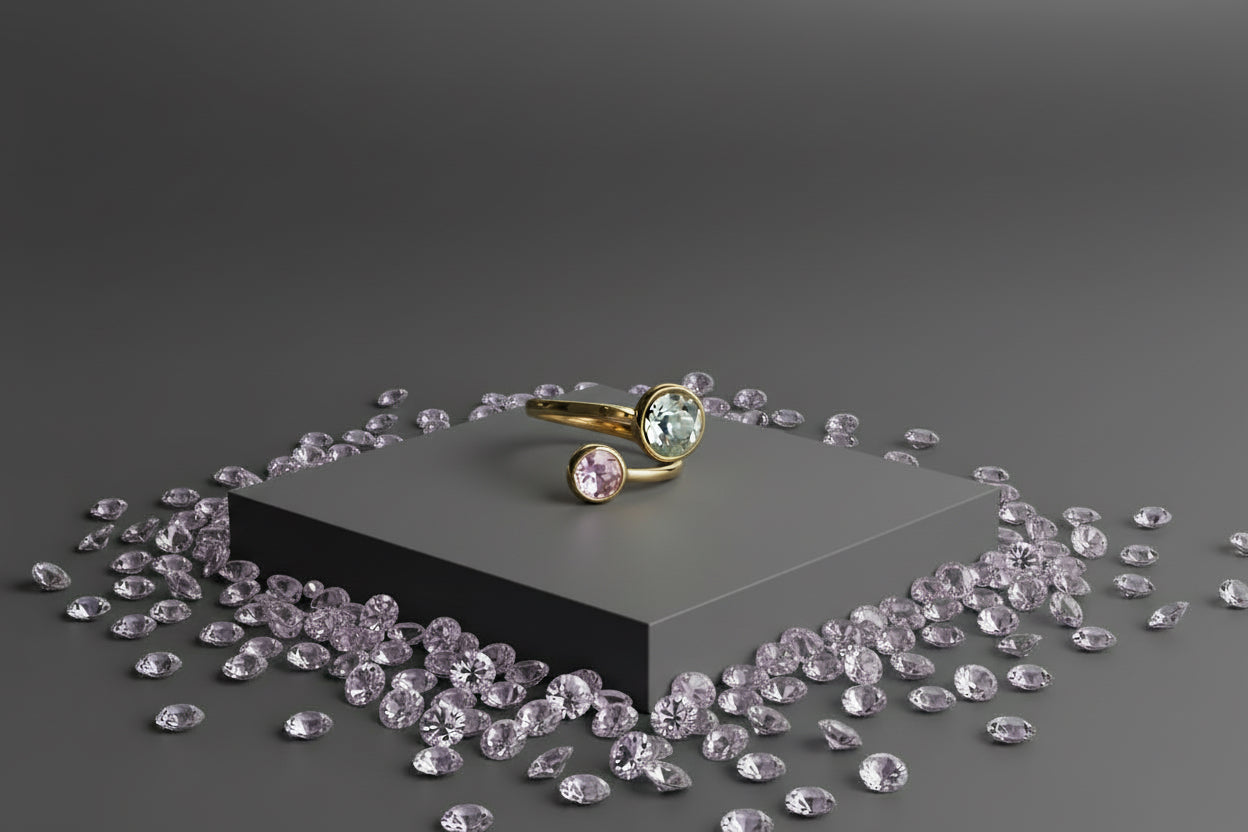 Material Base: Acero Inoxidable 316L (calidad superior e hipoalergénico). Acabado: Baño de color dorado de alta resistencia. Piedras: Dos Gemas Sintéticas redondas en colores contrastantes. Engaste: Seguro y moderno, tipo bisel.