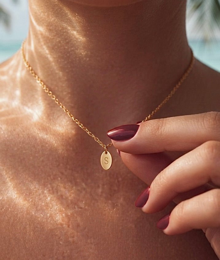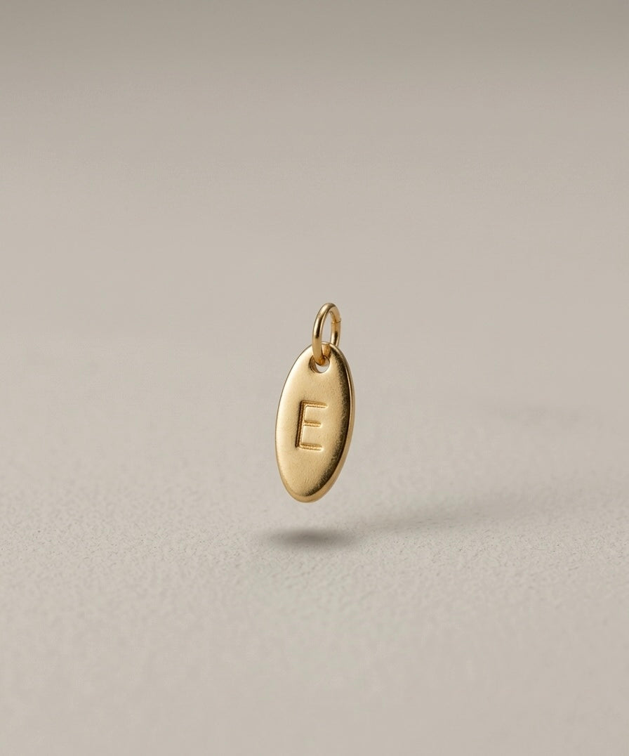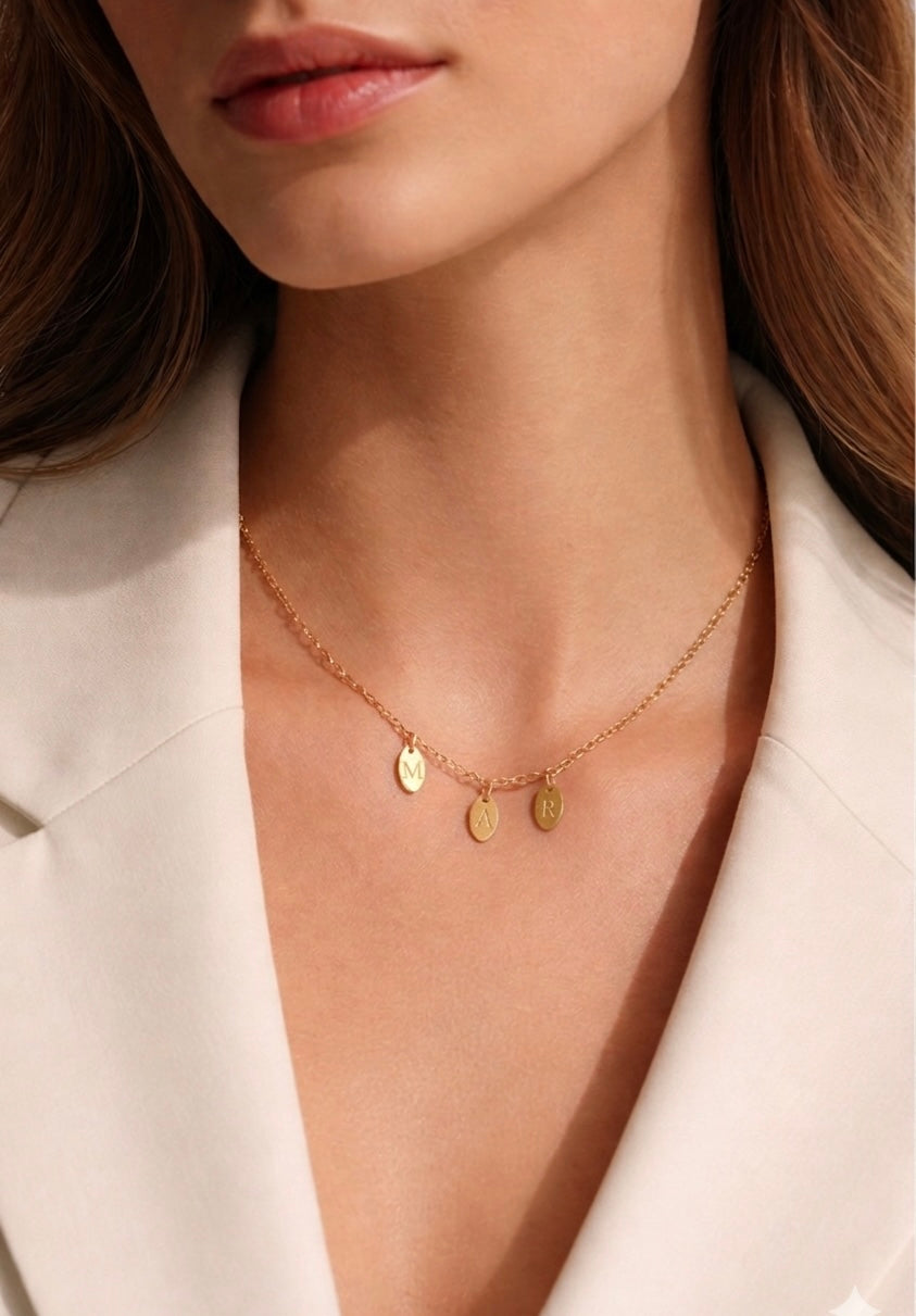 • Dije ovalado personalizado grabado con la inicial que elijas (como en la foto de ejemplo)